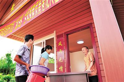 今年“威马逊”台风期间,年过六旬的陈仕裕已住了数十年的主房倒塌,他因此不得不蜗居在屋顶也受到部分损坏的厨房里。这一情况上报到开发区管委会后,引起负责人的高度重视。在他们的呼吁和联系下,由海口市民政局救助3.9万元,北京理工大学海南校友会捐助5万元,海南昆仑新材料科技公司捐助3万元并承建了这栋新房。这是一栋漂亮的新型木塑板房屋,高高的屋顶,三面窗户,通风透气,总面积34平方米,通体呈红褐色。据了解,这种木塑板是昆仑公司利用木渣和废塑料混合制作、可循环充分利用的新材料制成的。